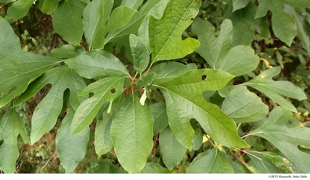 A close-up of the sassafras. A tea can be made from the bark of the roots. It's supposed to be delicious, but a lot of work to prepare safely.