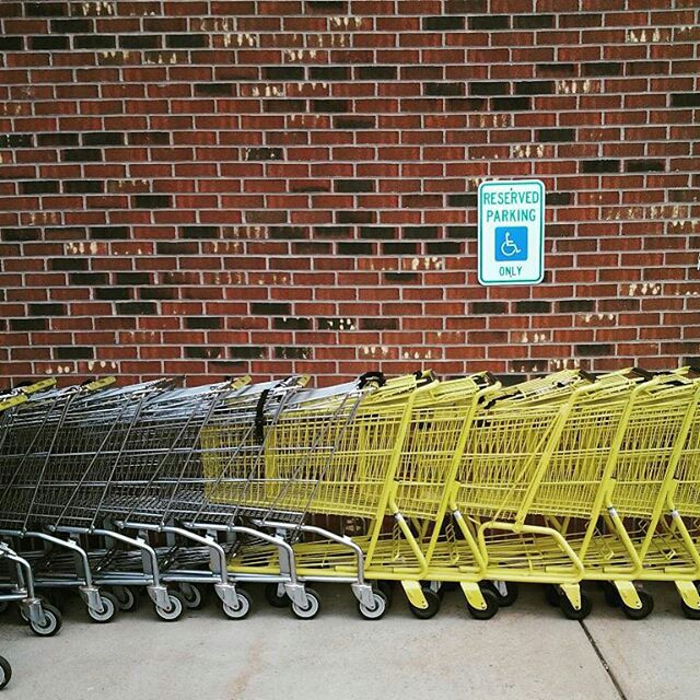 - brick wall, red, shopping cart, signs, yellow