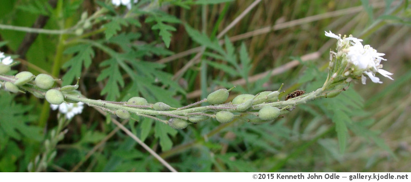 Like most members of the Brassicaceae, flowers of Berteroa incana begin blooming at the bottom of the raceme, followed by seed pods.