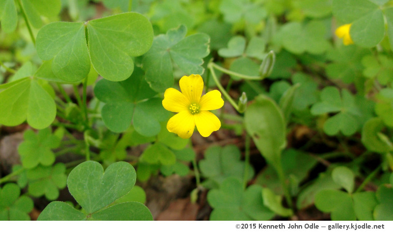 A single bloom and the deeply lobed leaves of Oxalis europaea.