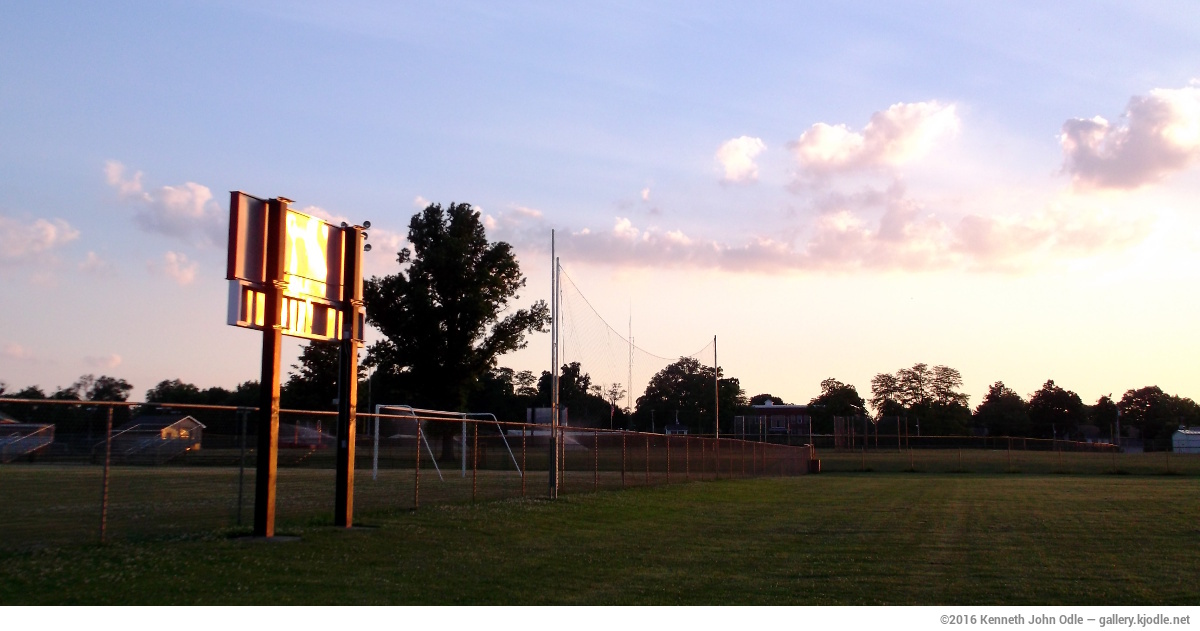 As I was wandering behind the softball field, the back of this scoreboard kept catching my eye, because the sun would sometimes reflect off the back of it, depending on the angle between me and scoreboard. Such moments are fleeting, and you have to move quickly. This shot might have been better if I had been standing on top of a ten-foot ladder.